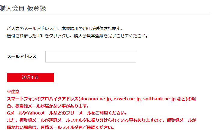 そうすると、仮登録の画面にいくので、メールアドレスを入力する。そして送信をクリックします。